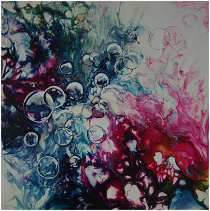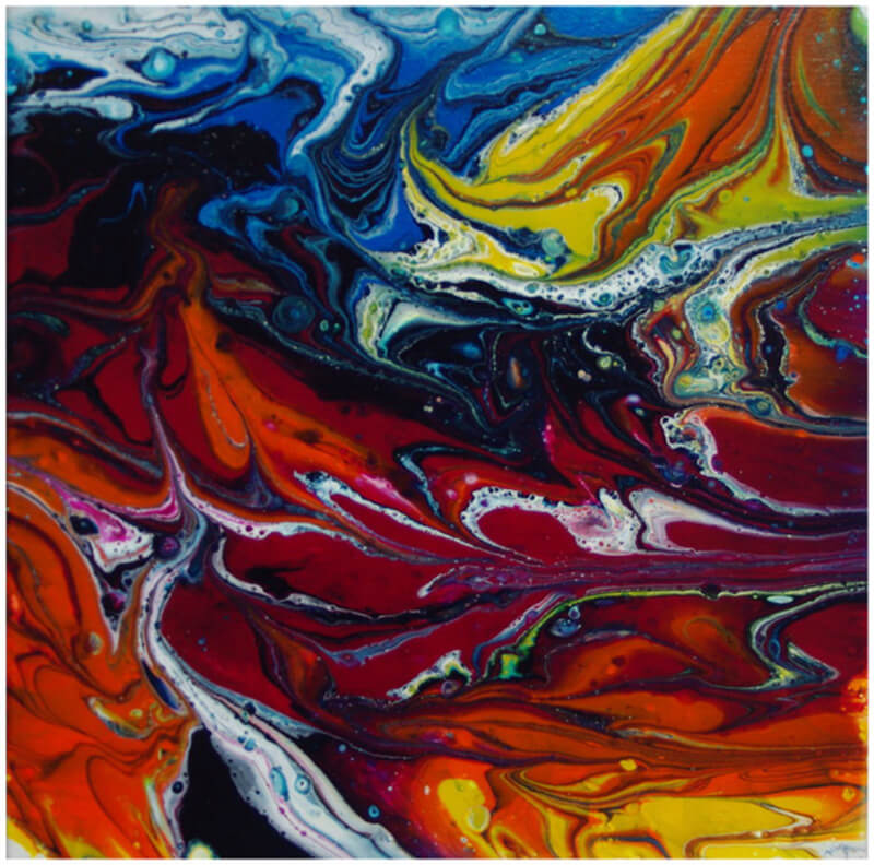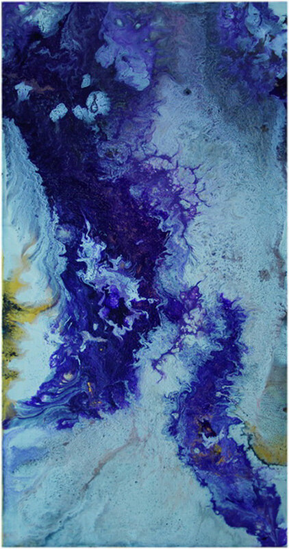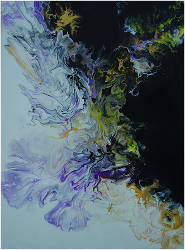 Créations abstraites et goût pour les remous m’ont orientée vers la peinture fluide dite » Pouring », technique constitutive de l’Action Painting.