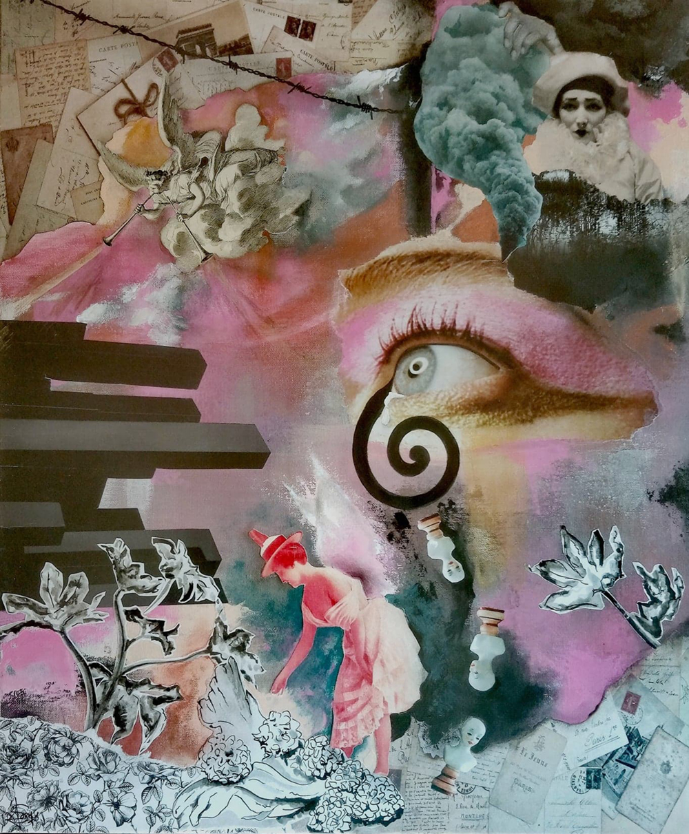 Puis la COVID est arrivée, temps de pause où j’ai parcouru les réseaux, affamée de nourriture artistique et de relations sociales. J’y ai découvert une artiste collagiste allemande, Lydia Rink, qui me donna l’envie d’essayer le collage. Dès lors, cet art ne m’a plus quitté. Je concilie cette passion dévorante avec un de mes principes de vie : le recyclage. Je fouine dans les boutiques de secondes mains, je récupère des toiles usagées, je retape des cadres abîmés, je décolle des étiquettes sur les bouteilles …Tout y passe!